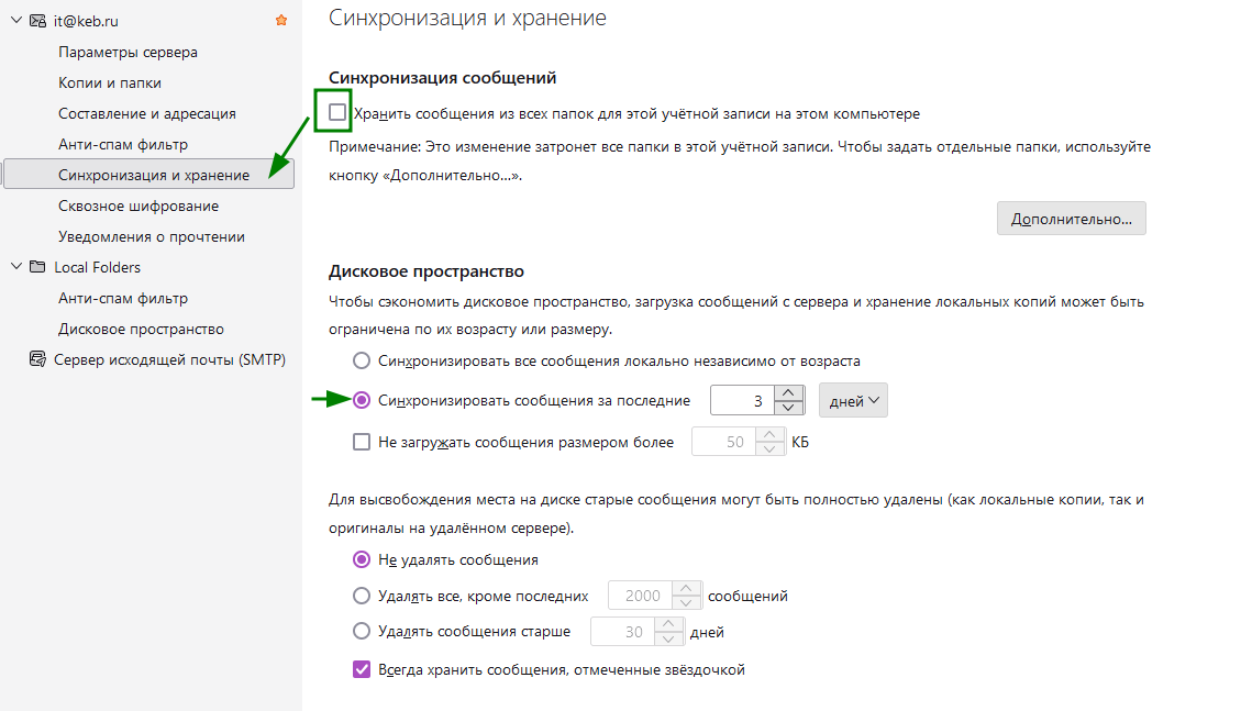 Убираем галочку "Хранить сообщения из всех папок для этой учётной записи на этом компьютере", чтобы не тратить место на диске, либо можно синхронизировать сообщения, но поставить максимальный возраст и размер таких писем.